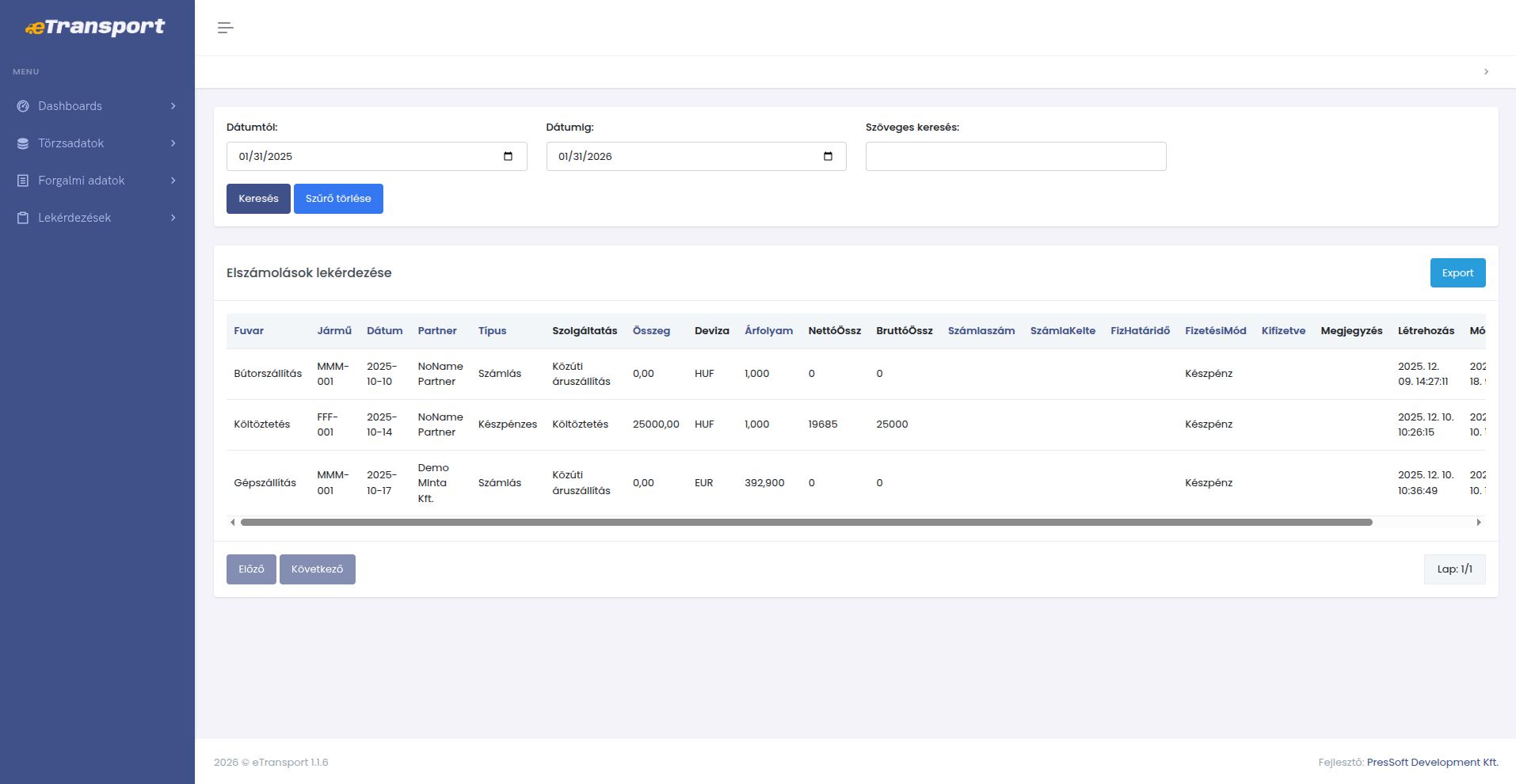A rendszerben kezelt forgalmi és adminisztrációs adatok CSV formátumban exportálhatók, így könnyen tovább feldolgozhatók más rendszerekben vagy kimutatásokhoz.