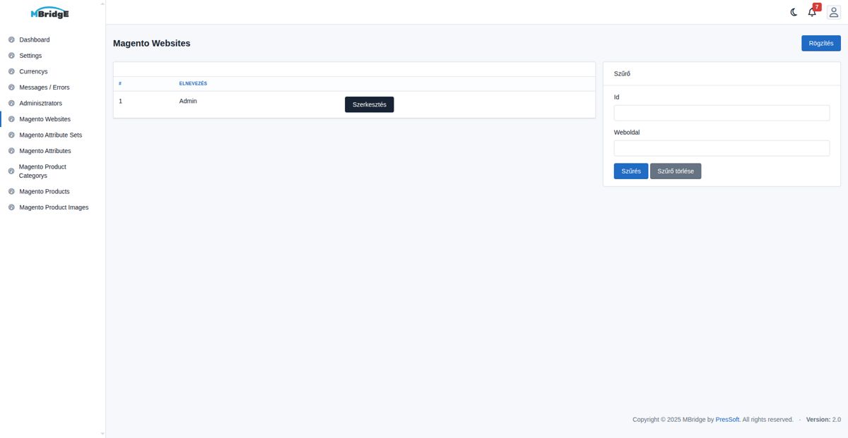 MBridge fantázia néven indíttottuk útjára egyedi fejlesztésű rendszerünket, amelynek a 2.0-ás változata jelenleg is fejlesztés alatt van. Az MBridge Connector megoldásunkkal lehetőség nyílik a Magento 2 webáruházad gyors egyszerű és programozott frissítésére. A megoldás segítségével könnyen tudsz kapcsolódni, ERP, Készletkezelő, Ügyviteli rendszeredhez. Az MBridge Connector egyedi fejlesztésű rendszer, amelyet mindig az aktuális projekt számára bővítünk. Egy fontos alapot bizítosít ahhoz, hogy automata módon tudjunk,